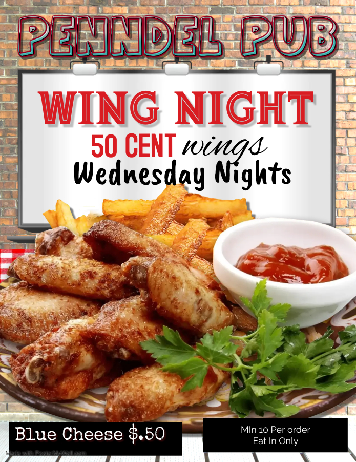 Come by the PUB on Wednesdays for 50¢ wings! Minimum 10 per order. Eat in only.