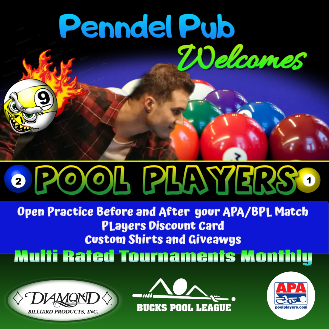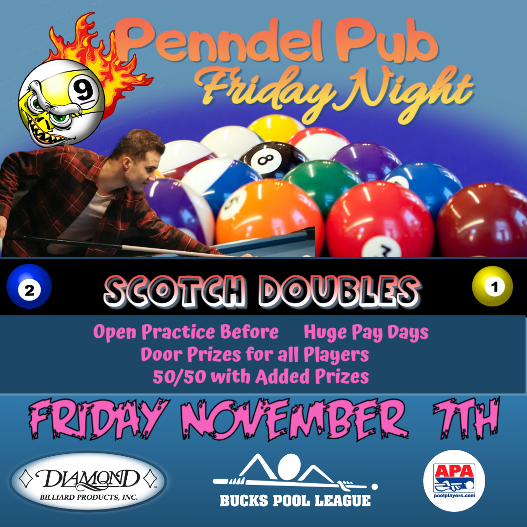 Rack ’em up, Friday night’s heating up! Join the Penndel Pub Pool Tournaments — open practice before, huge pay days and 50/50 added with prizes.