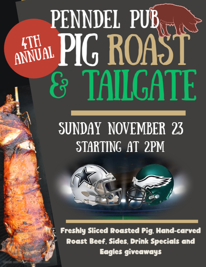 Tailgate with us at the 4th Annual Pig Roast as the Eagles take on the Cowboys. Freshly sliced roasted pig, hand-carved roast beef, drink specials, and Eagles giveaways.